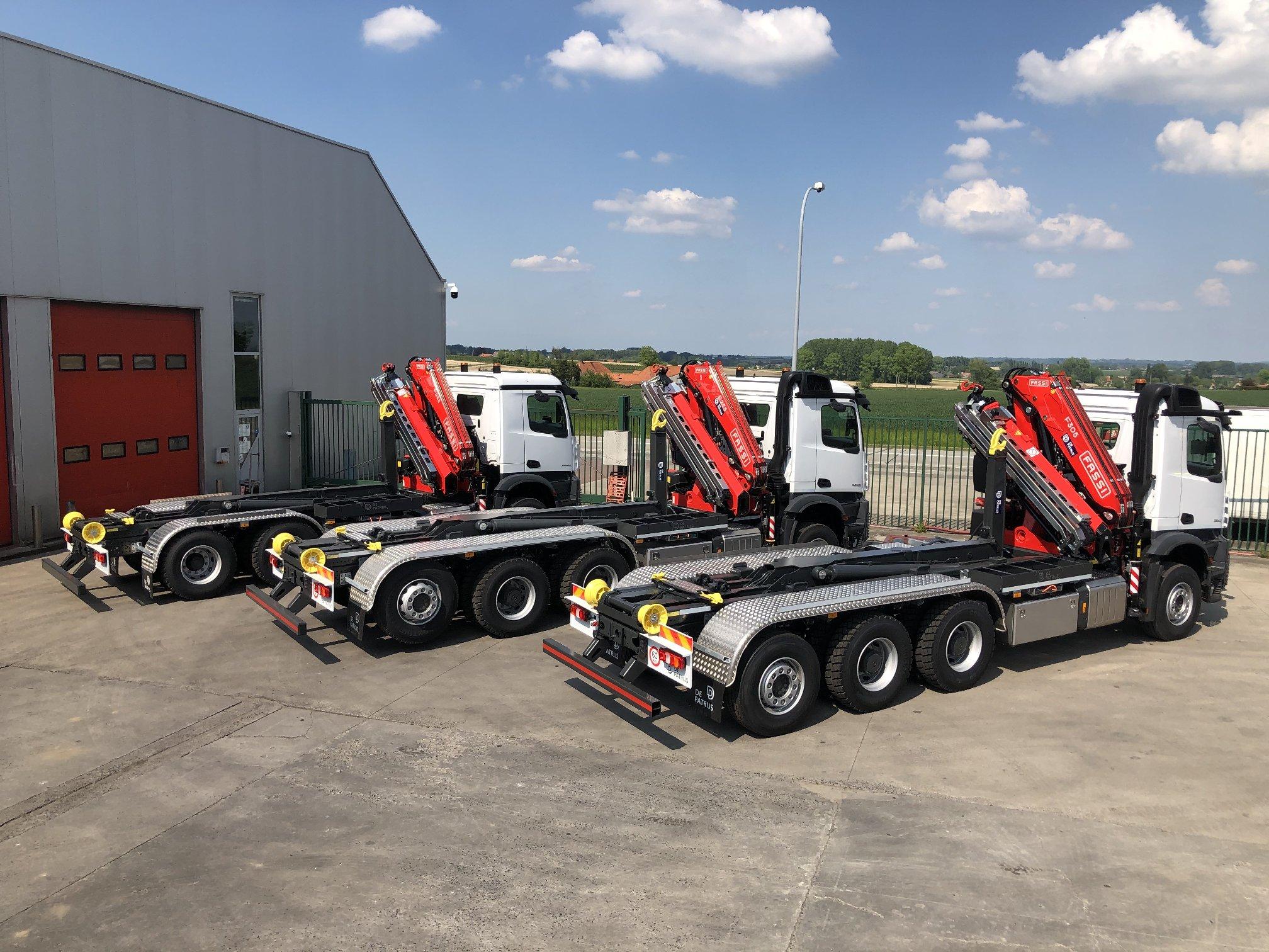 Opbouw: Kraan FASSI F305 | afstandsbediening | extra functies voor rotator/grijper - Containersysteem Marrel AL20, containers tot 6.1m, materiaalkoffer rechts